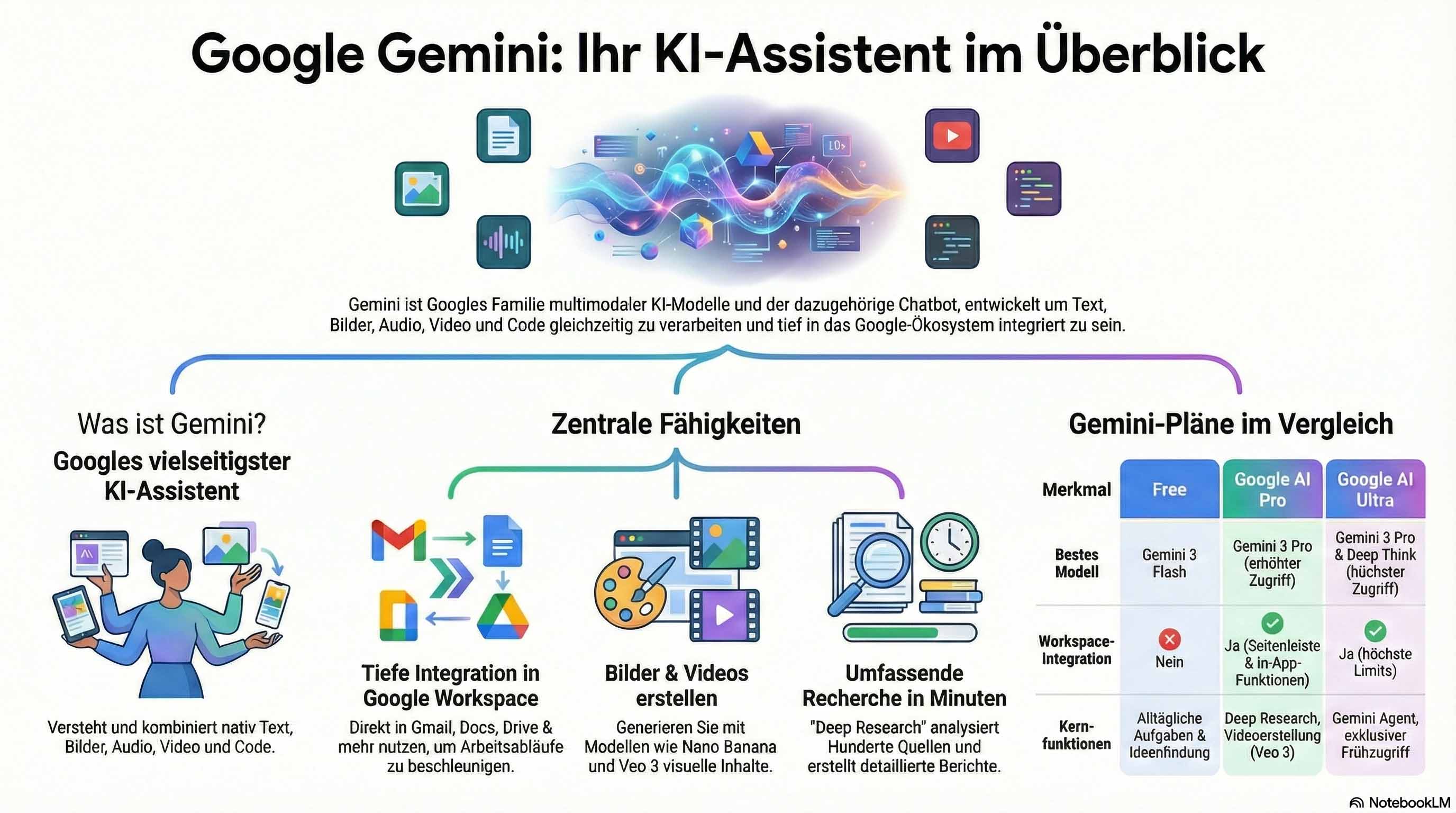 Gemini ist ein Assistent, der direkten Zugriff auf deinen Aktenschrank hat. Er kann deine E-Mails durchsuchen, Dateien in Drive finden, Kalendereinträge erstellen – ohne dass du irgendetwas kopieren oder hochladen musst.